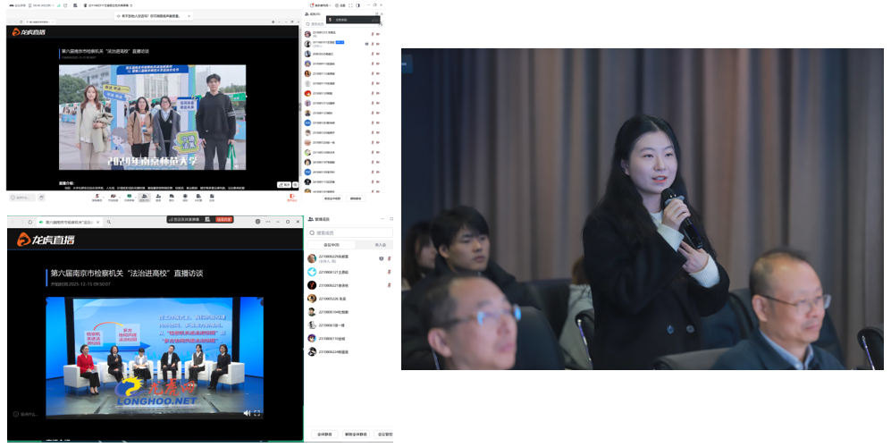 12月中旬,应南京市人民检察院邀约,学院党委组织各学生支部线上线下集中观看龙虎网“‘检’爱青春,‘宁’护未来”直播访谈活动,院办党支部、计算机第二党支部和2024级专硕党支部师生党员代表参与现场录制活动。在直播现场,嘉宾团围绕大学生法治意识现状、法律风险成因及防范对策展开深度探讨,直击校园生活中的法治痛点。在互动提问环节,计算机第二党支部学生支部书记周晋萱作为学生代表,向现场检察官请教在校大学生如何合法维权问题。在“问需、问计、问效”普法教育活动中,同学们沉浸式体验增强法治维权意识、严守法治底线、筑牢法治信仰的必要性。